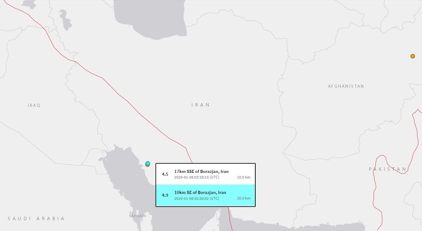 Un sismo de 4.9 grados fue reportado a las 2 horas con 20 minutos de la medición internacional con epicentro a 10 kilómetros al sureste de la población de Borazjan, Irán este 7 de enero del 2020.