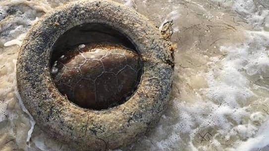 Gran indignación han causado las fotografías en la que se aprecia a una tortuga marina muerta, atorada dentro de una llanta de automóvil, en playas de Chicxulub, Yucatán.