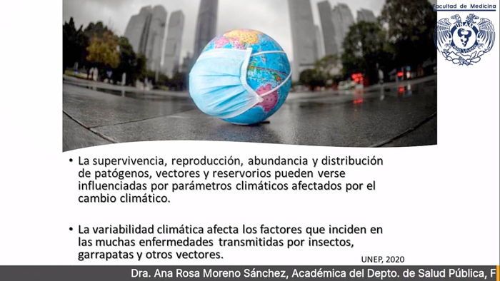 Eventos como el cambio climático pueden incidir en la supervivencia, reproducción, abundancia y distribución de patógenos, vectores (ser vivo que transporta y transmite un patógeno) y reservorios, y en consecuencia tener efecto en enfermedades transmitidas por mosquitos y garrapatas, ejemplificó Ana Rosa Moreno Sánchez, investigadora del Departamento de Salud Pública de la Facultad de Medicina (FM) de la UNAM.