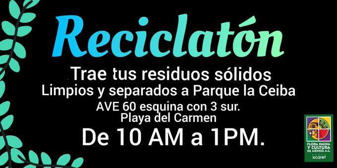 Este 26 de abril, como cada mes, se llevará a cabo el Reciclatón, la recolección de desechos será en el parque La Ceiba en Playa del Carmen a partir de las 10 am y hasta la 1 pm. Podrás llevar materiales inorgánicos, papel, plástico, metal, vidrio, madera y tela.