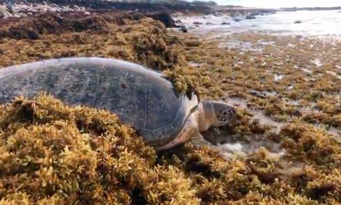 El sargazo que arriba a las costas de Mahahual esta afectando gravemente a las tortugas marinas que llegan a depositar sus huevos a alguna zona segura de las playas. La organización ambientalista Proyecto Aak Mahahual, publicó un video a través de su cuenta de Facebook, del momento exacto que una tortuga marina lucha para cruzar la barrera de sargazo y poder llegar a la zona de playas y depositar sus huevos.