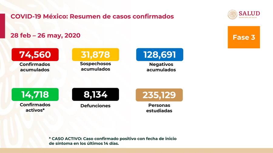 México registró 501 muertos y tres mil 455 nuevos casos de coronavirus en las últimas 24 horas, de acuerdo con el reporte de este 26 de mayo de 2020, de la Secretaría de Salud.