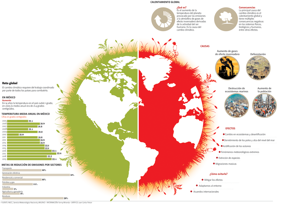 El aumento de la temperatura a escala global durante la última década es un hecho ya comprobado por la Organización Meteorológica Mundial y en México las cifras son reveladoras: desde hace 15 años el país comenzó a registrar un alza en las temperaturas, pero desde 2014 se han vivido los años más cálidos desde que se tiene registro, con un aumento de la temperatura de entre 1.2 y 1.7 grados, una tendencia atribuible al cambio climático, reconocieron el Servicio Meteorológico Nacional (SMN) y el Instituto Nacional de Ecología y Cambio Climático (INECC).