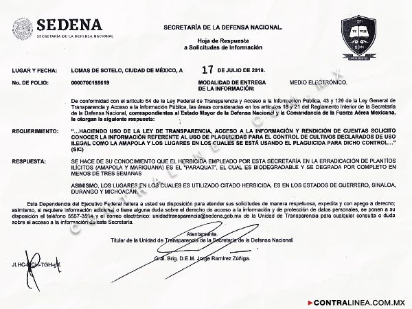 En respuesta a la solicitud de información 0000700185619 presentada por Contralínea, la Sedena admite que ese herbicida es el paraquat, considerado por la Organización Mundial de la Salud (OMS) como altamente tóxico y peligroso, y cuyo uso está prohibido en 38 países y restringido en otros 50, pero no en México.