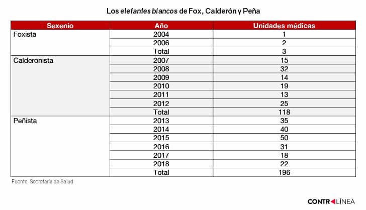 El gobierno de López Obrador recibió 317 elefantes blancos en el sector salud. Tres de esas unidades médicas inconclusas datan de 2004 y 2006, cuando la Presidencia estaba en manos del expanista Vicente Fox; 118 obras negras son herencia del panista Felipe Calderón; mientras que 196 construcciones sin terminar provienen de la gestión del priísta Peña Nieto