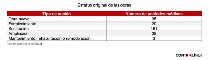 Al cierre del sexenio de Peña Nieto, noviembre de 2018, el estatus con el cual el entonces nuevo gobierno federal recibía las 317 instalaciones de salud era de: 158 obras en proceso y 159 suspendidas. Para febrero de 2021, éste cambió a 131 obras terminadas, 117 suspendidas, 52 en proceso y 17 canceladas (en estas últimas se gastó alrededor de 354 millones 631 mil pesos), indica la información obtenida por Contralínea por medio de la Ley de Transparencia.