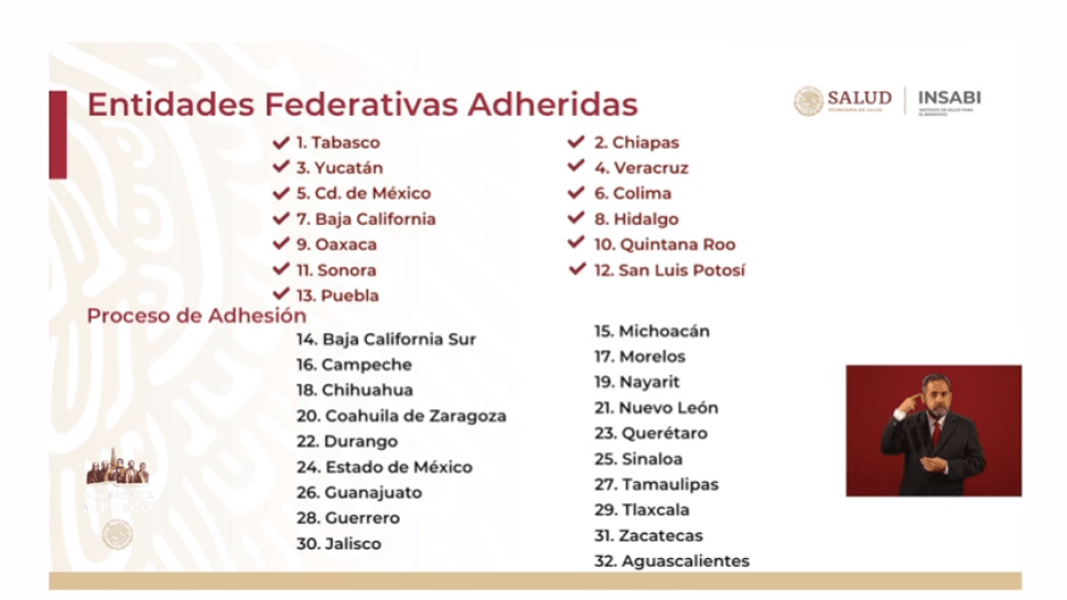Aseveró que los 69 millones de mexicanos sin seguridad social se verán beneficiadas del Insabi. Manifestó que los 32 estados de la república han mostrado interés en el nuevo modelo de salud para el bienestar. “En las próximas dos semanas los estados formalizarán su adhesión al Insabi”, dijo.