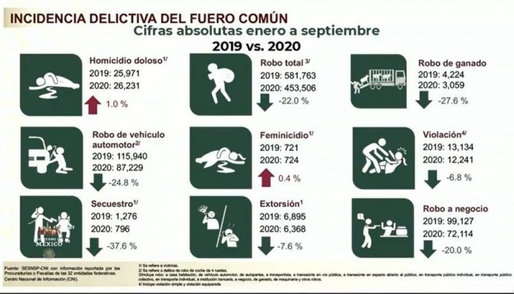 De acuerdo a las cifras mencionadas durante la mañanera, los feminicidios y homicidios dolosos fueron los únicos delitos que aumentaron su incidencia en un 0.4 y 1.0% respectivamente de enero a septiembre de este año.