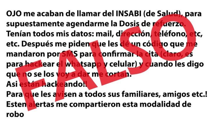 Buenas tardes: OJO: me acaban de llamar del Insabi (de Salud), para supuestamente agendarme la dosis de refuerzo. Tenían todos mis datos: mail, dirección, teléfono, etc, etc. Después, me piden que les dé un código que me mandaron por SMS para confirmar la cita (claro, es para hackear el WhatsApp y celular) y, cuando les digo que no se los voy a dar, me cortan.