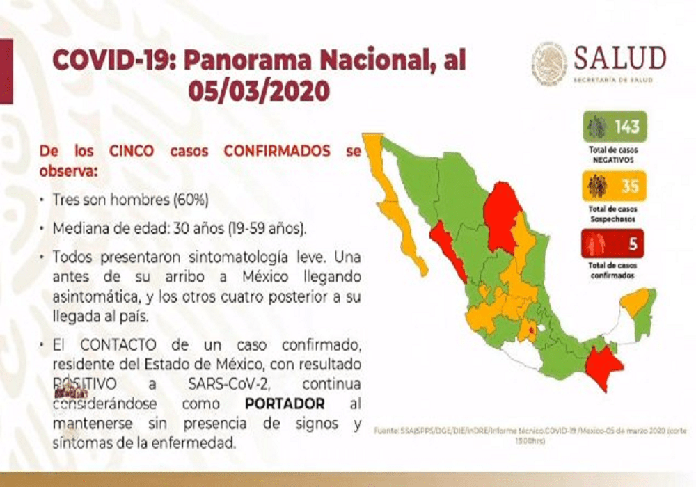 En México, aún hay únicamente 5 casos confirmados de coronavirus, mientras que hay 35 posibles casos. Así lo dio a conocer este jueves en conferencia de prensa la Secretaría de Salud.