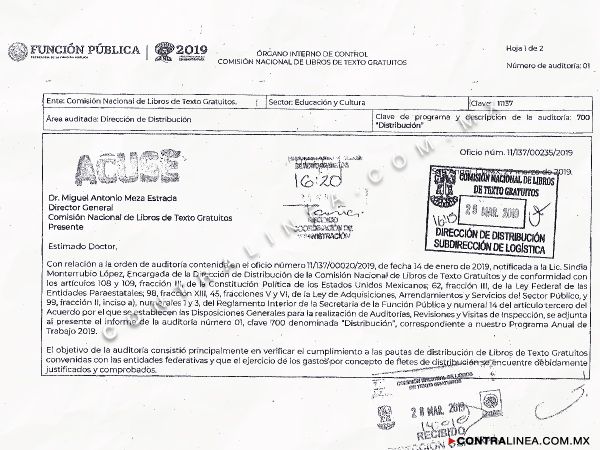 La auditoría 01/2019, elaborada por el Órgano Interno de Control (OIC) y concluida el pasado 28 de marzo, expone que la Conaliteg carece de un proceso sistematizado con el cual controle el gasto en esta materia, y tampoco da seguimiento puntual a los fleteros, por lo cual al parecer se habrían pagado servicios de más.