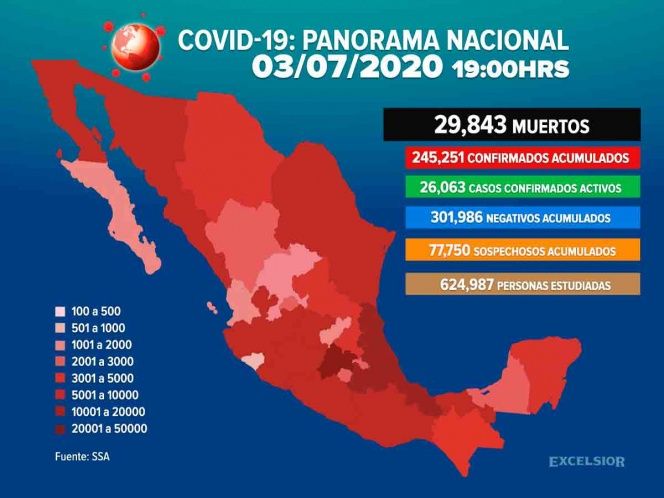 Este viernes 03 de julio, México llegó a los 29 mil 843 muertos por la pandemia de Covid-19 que afecta al país, en tanto, la cifra de casos confirmados por el patógeno es de 245 mil 251, revelaron datos de la Secretaría de Salud federal.