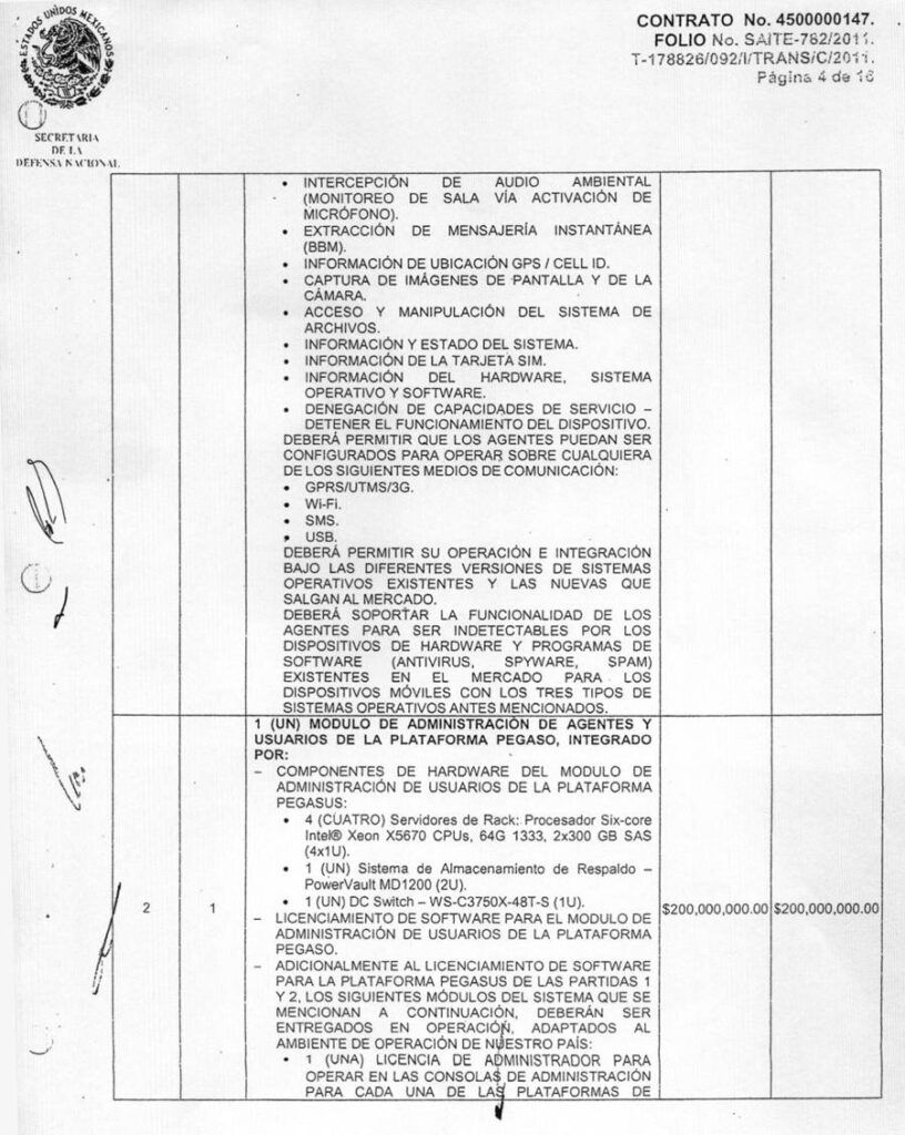 La plataforma Pegasus, el más avanzado software de espionaje en el mundo, fue adquirido originalmente por el gobierno de Felipe Calderón para ser ejecutado por la Sección Segunda –inteligencia militar– y la Sección Séptima –operaciones contra el narcotráfico– de la Secretaría de la Defensa Nacional (Sedena). Los contratos, de los cuales Contralínea posee copia, fueron firmados entre septiembre de 2010 y finales de 2012 por más de 8 mil millones de pesos.