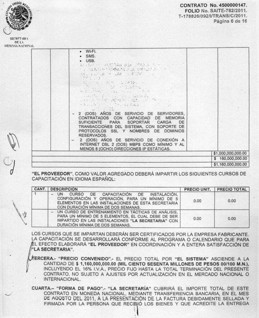 Con otro contrato –4500000525, folio SAITE-135/2011– se adquirieron ocho estaciones remotas móviles de radiocomunicación y sistemas de inteligencia. La Sedena pagó 1 mil 160 millones de pesos y el instrumento fue firmado el 3 de noviembre de 2011.