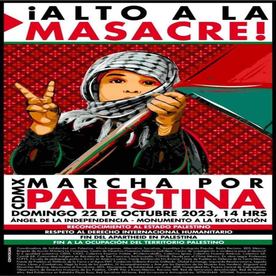 Ante esto 50 organizaciones sindicales, estudiantiles, sociales, civiles, de derechos humanos, ecologistas y feministas convocan a una movilización unitaria para este domingo 22 de octubre a las 2 de la tarde, del Ángel al Monumento a la Revolución. Exigen el reconocimiento al Estado palestino, Respeto al derecho internacional Humanitario, Fin del Apartheid en Palestina y Fin a la ocupación del territorio palestino.