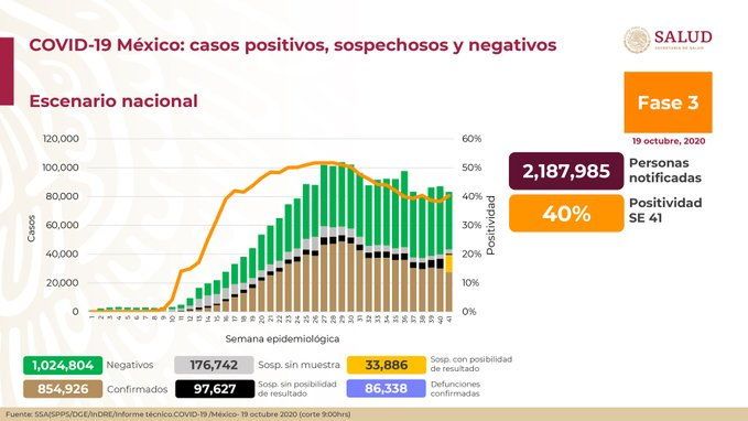 Al 19 de octubre de 2020 hay 854,926 casos confirmados #COVID19. Se han registrado 1,024,804 negativos, 86,338 defunciones confirmadas y 623,494 personas recuperadas. pic.twitter.com/KXFzlqFBmx