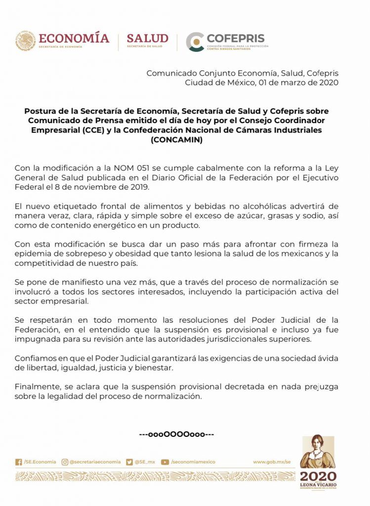 El Gobierno Federal defendió este domingo el nuevo etiquetado de alimentos para combatir la obesidad, esto, después de que el Consejo Coordinador Empresarial (CCE) reveló que una jueza suspendió el proceso de creación de la norma por un recurso legal del sector privado.