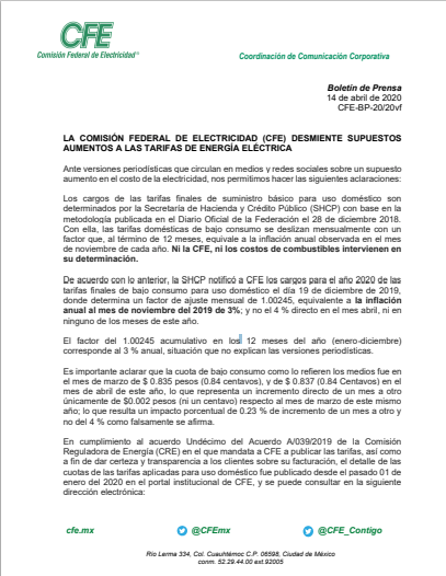 De acuerdo con lo anterior, la SHCP notificó a CFE los cargos para el año 2020 de las tarifas finales de bajo consumo para uso doméstico el día 19 de diciembre de 2019, donde determina un factor de ajuste mensual de 1.00245, equivalente a la inflación anual al mes de noviembre del 2019 de 3%; y no el 4 % directo en el mes abril, ni en ninguno de los meses de este año.