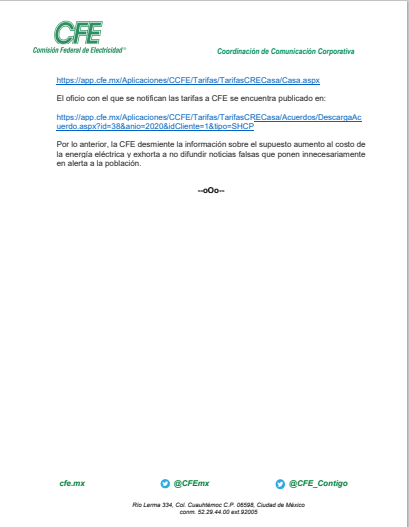 Por lo anterior, la CFE desmiente la información sobre el supuesto aumento al costo de la energía eléctrica y exhorta a no difundir noticias falsas que ponen innecesariamente en alerta a la población.