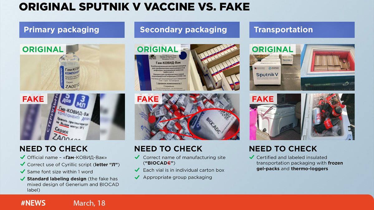 Como informó el Fondo Ruso de Inversiones Directas (RDIF), el 18 de marzo de 2021, después de un análisis comparativo de los empaques, las supuestas vacunas, no corresponden en nombre oficial ni en diseño de etiqueta a las producidas por el país.