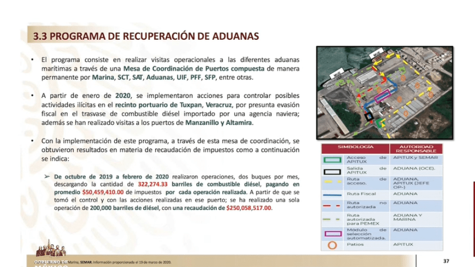 El almirante José Rafael Ojeda Durán, titular de la Semar, presentó el programa “Recuperación de Aduanas Portuarias” en la conferencia mañanera, en la cual dio a conocer los barcos que llegaban al puerto mencionado, eran descargados por pipas en la madrugada sin pasar por el recinto fiscal.