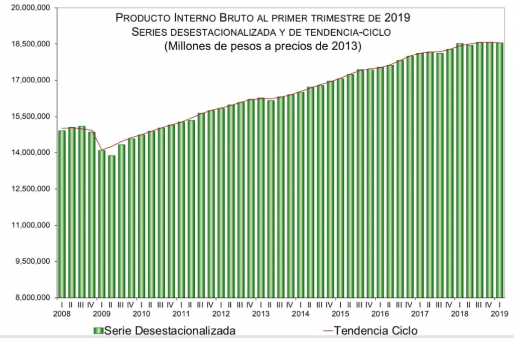 Con cifras ajustadas por estacionalidad, el PIB mostró una disminución de 0.2 por ciento en términos reales durante el primer trimestre de 2019 respecto al precedente, pero en su comparación anual, mostró un avance de 0.1 por ciento.