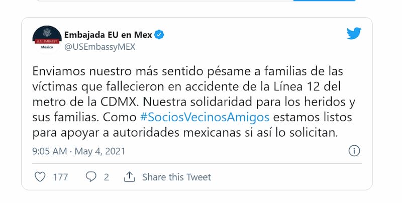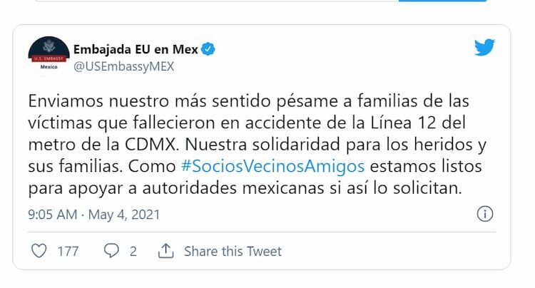 “Enviamos nuestro más sentido pésame a (las) familias de las víctimas que fallecieron en (el) accidente de la Línea 12 del metro de la Ciudad de México. Nuestra solidaridad para los heridos y sus familias. Como socios, vecinos y amigos estamos listos para apoyar a (las) autoridades mexicanas si así lo solicitan”, sostuvo la representación diplomática en sus redes sociales.