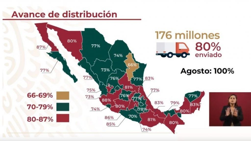 Esteban Moctezuma señaló que el avance de la distribución hasta el día de hoy es de entre 80 % y 87% y será a finales de agosto cuando se tenga una cobertura del 100% en las escuelas de la República Mexicana.