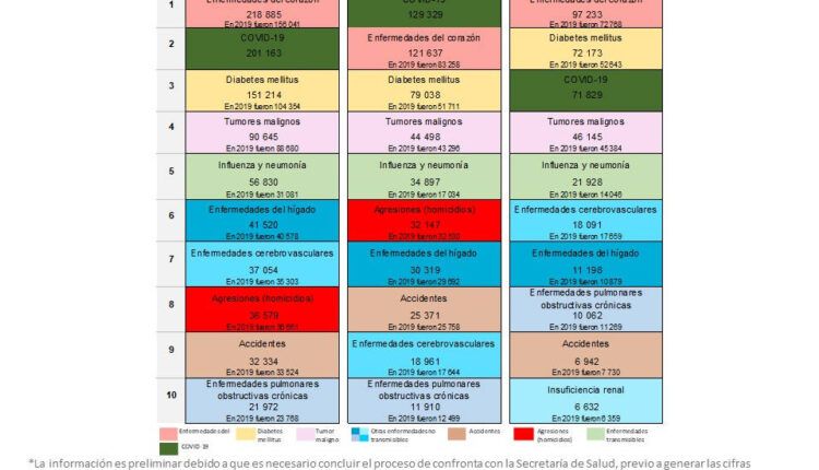 Las tres principales causas de muerte a nivel nacional son por enfermedades del corazón (218 mil 885, 20.2%), por COVID-19 (201 mil 163, 18.5%) y por diabetes mellitus (151 mil 214, 13.9%).