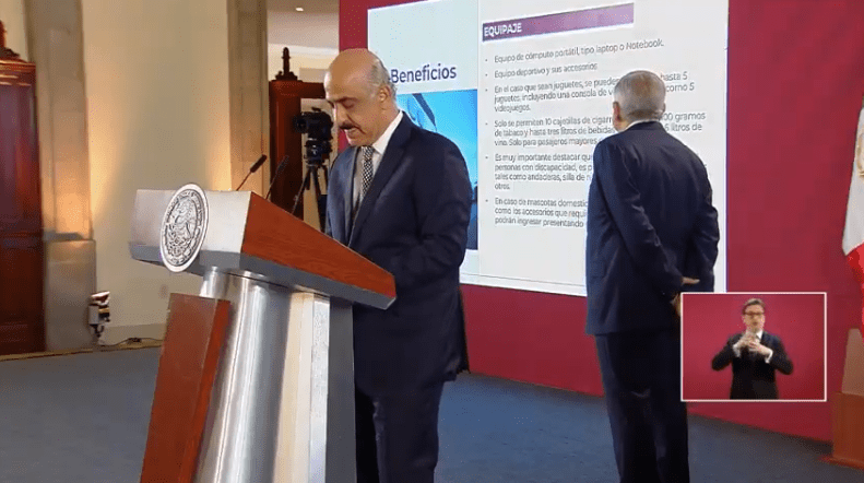 Ricardo Ahued dijo que solo se permiten diez cajetillas de cigarros, no diez paquetes, 25 puros y 200 gramos de tabaco. Además, 3 litros de bebidas alcohólicas y 6 litros de vino, solo para pasajeros de 18 años.