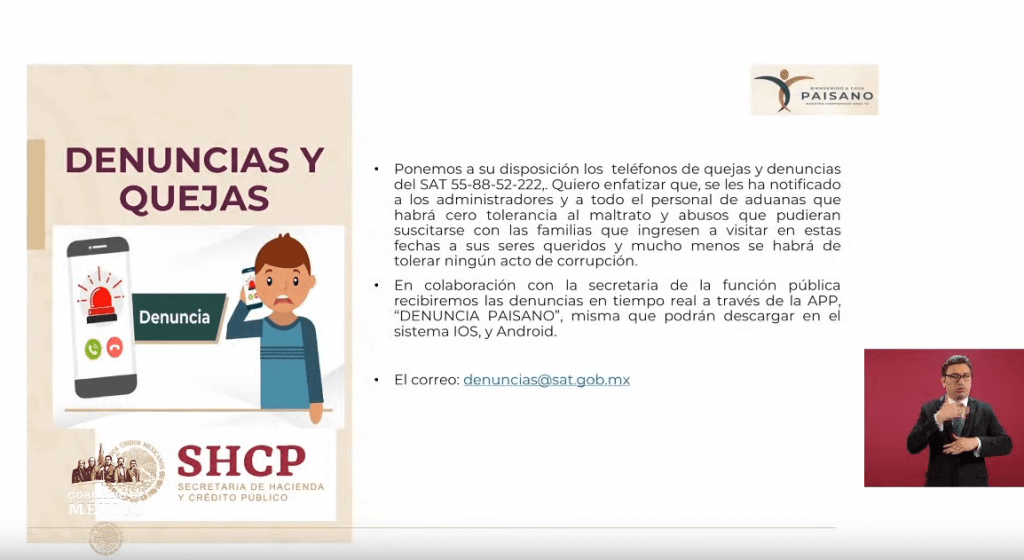 Se pone a disposición de los visitantes los números del SAT 55-88-52-222, también se reciben denuncias en tiempo real a través de la aplicación ‘Denuncia Paisano’, que se puede descargar en plataforma Android o iOS. También se puede usar el correo electrónico denuncias@sat.gob.mx