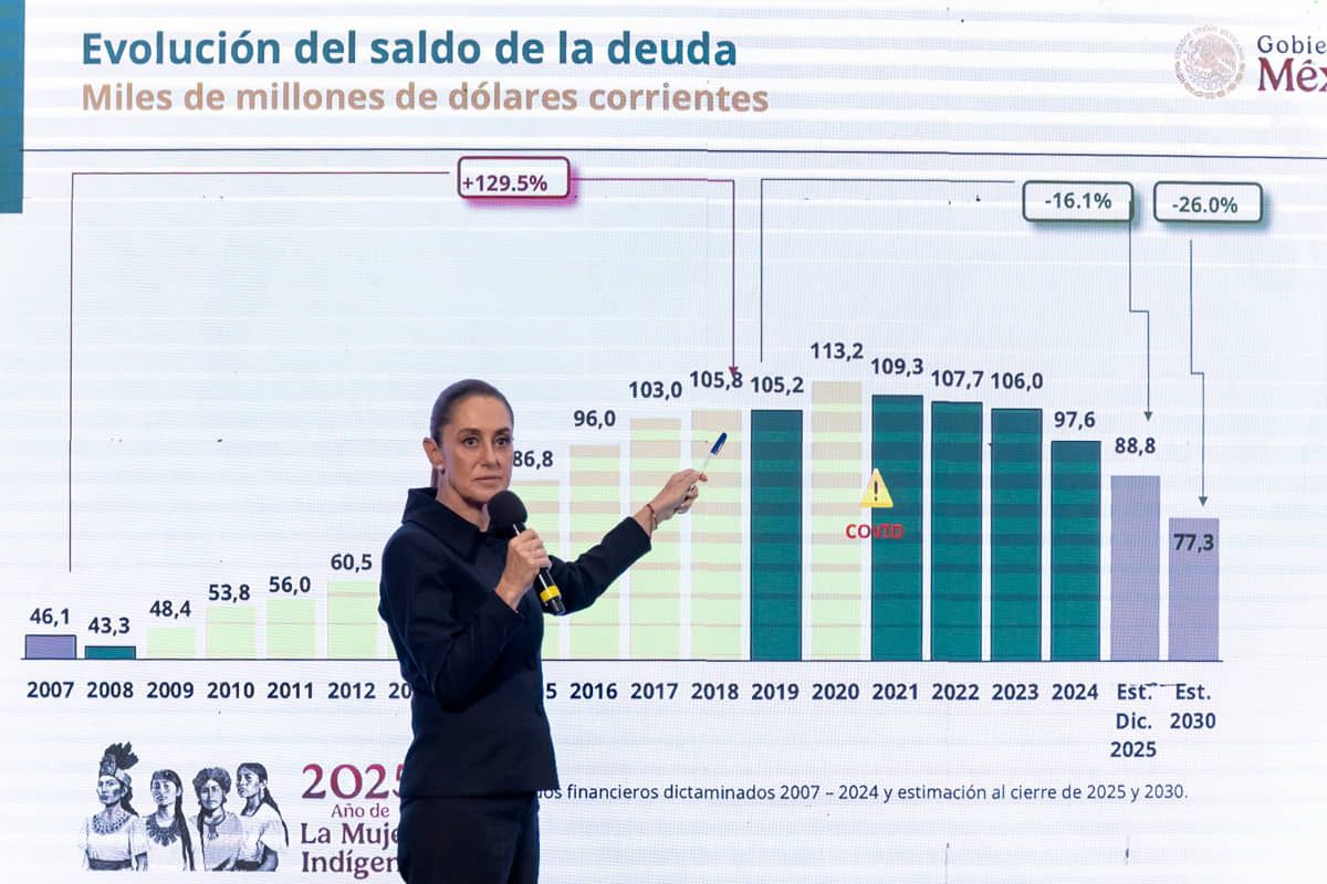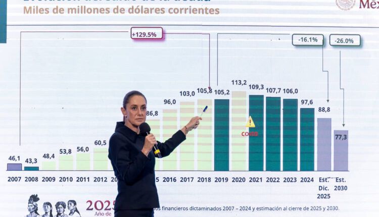 Sheinbaum subrayó que, tras un pico máximo de pasivos, el gobierno del expresidente López Obrador logró reducir la deuda a 97,600 millones de dólares en 2024. La proyección es llegar a 88,800 millones en 2025 y a 77,300 millones al cierre de la actual administración en 2030.