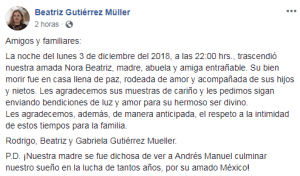 La noche de ayer lunes, falleció Nora Beatriz Müller Bentjerodt, suegra de Andrés Manuel López Obrador. Así fue anunciado por Beatriz Gutiérrez Müller a través de sus redes sociales.