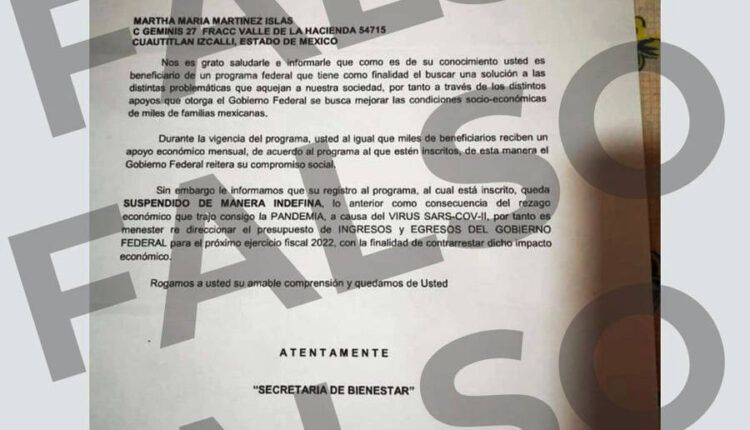 A través de su cuenta de twitter la Secretaría del Bienestar informó que respetando al veda electoral, se informa a al ciudadanía que está circulando un documento falso mediante el cual se trata de hacer creer que dicho organismo está cancelando los registros de beneficiarios de programas sociales, por el “rezago económico” generado por la pandemia.