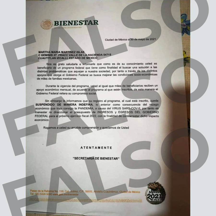 A través de su cuenta de twitter la Secretaría del Bienestar informó que respetando al veda electoral, se informa a al ciudadanía que está circulando un documento falso mediante el cual se trata de hacer creer que dicho organismo está cancelando los registros de beneficiarios de programas sociales, por el “rezago económico” generado por la pandemia.