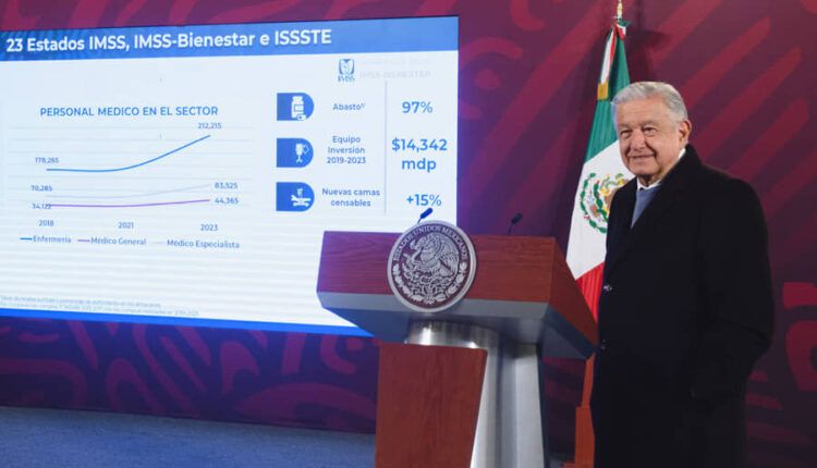 El mandatario recordó que el Plan de Salud IMSS Bienestar, aplicado en 23 estados, reporta un promedio de 97 por ciento en abasto de medicamentos en unidades de primer, segundo y tercer nivel de atención.