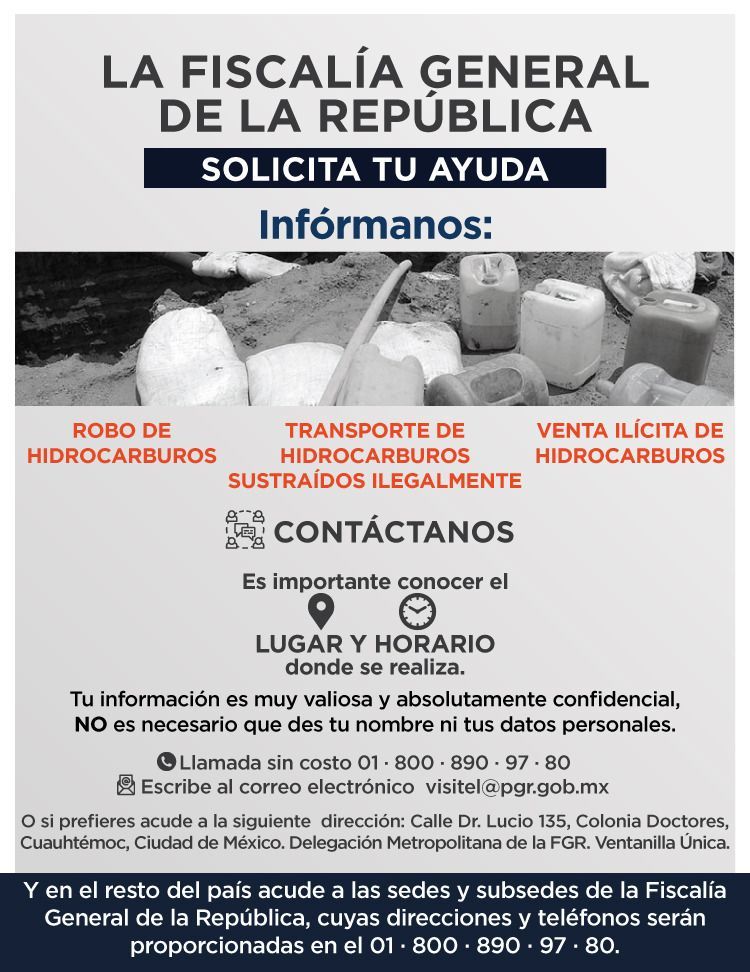 La Fiscalía General de la República (FGR) pone a disposición de la ciudadanía la línea telefónica 01 800 890 97 80 y el correo electrónico visitel@pgr.gob.mx, o si prefiere puede acudir a la Delegación de la FGR en la Ciudad de México, ubicada en Dr. Lucio 135, colonia Doctores, alcaldía Cuauhtémoc, Ciudad de México, para denunciar cualquier ilícito en materia de hidrocarburos.