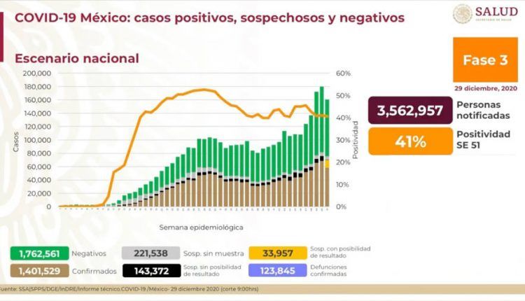 Las autoridades de Salud dieron a conocer, la noche del martes 29 de diciembre de 2020, que México acumula 1 millón 401 mil 529 casos confirmados y 1 millón 762 mil 561 casos negativos