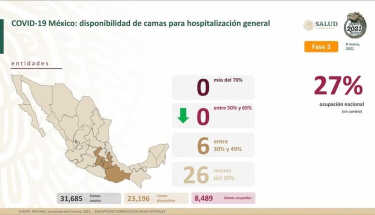 En cuanto a ocupación hospitalaria hay 23 mil 196 disponibles y 8 mil 489 están ocupadas.