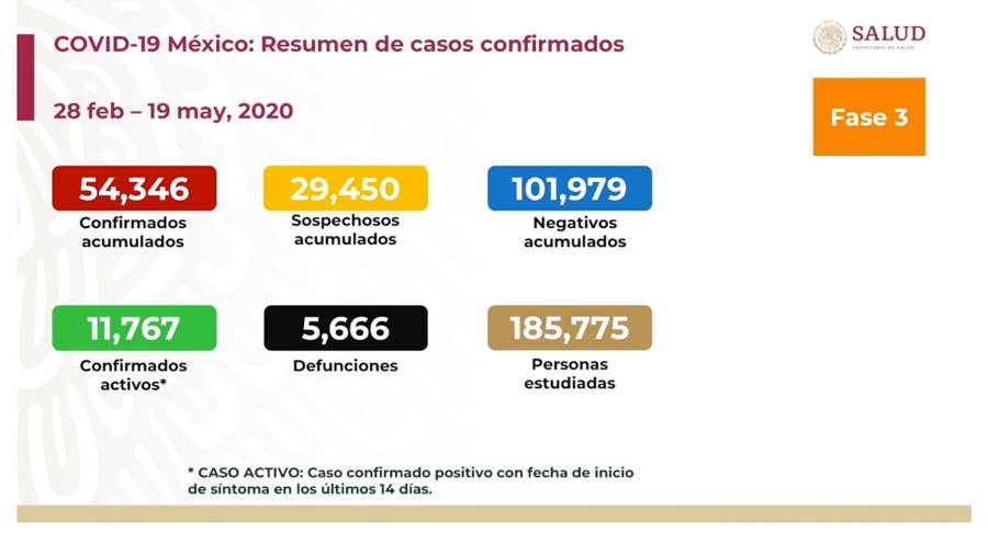 Al 19 de mayo de 2020 hay 54,346 casos confirmados, 11,767 confirmados activos y 29,450 sospechosos por #COVID19. Se han registrado 101,979 negativos, 5,666 defunciones confirmadas, 733 defunciones sospechosas y fueron estudiadas 185,775 personas. 1/3 pic.twitter.com/kkF9jAFFsU
