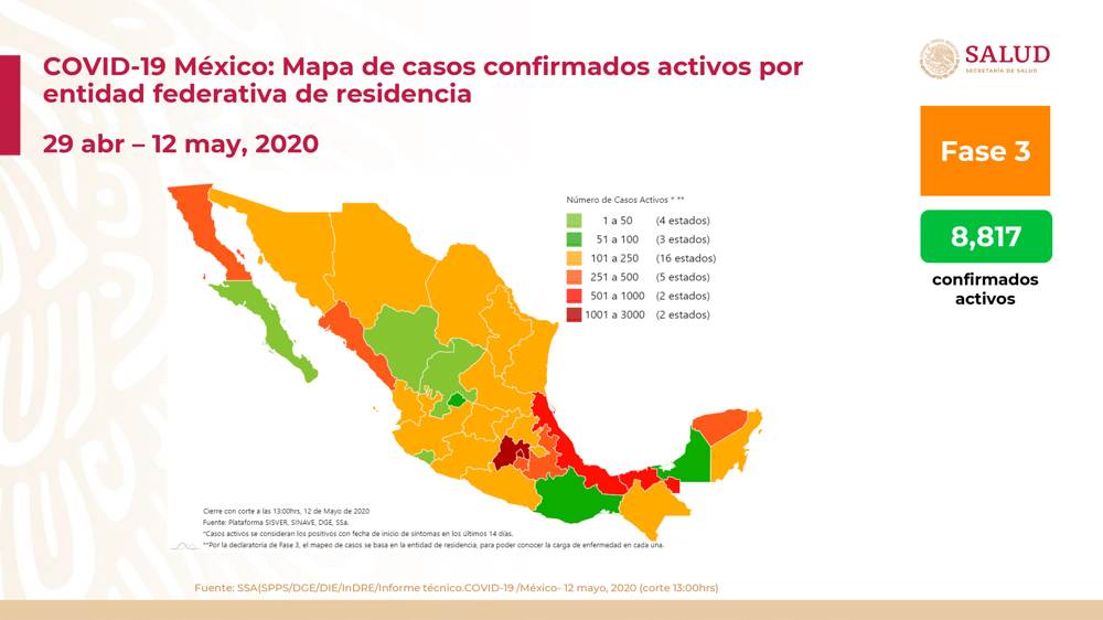 Al 12 de mayo de 2020 hay 38,324 casos confirmados, 8,817 confirmados activos y 22,980 sospechosos. Se han registrado 80,900 negativos, 3,926 defunciones confirmadas, 277 defunciones sospechosas y fueron estudiadas 142,204 personas.