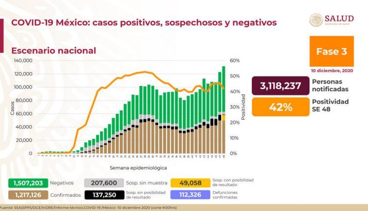 Autoridades de la secretaría de salud informaron que al 10 de diciembre de 2020 hay 1,217,126 casos confirmados de Covid-19. Se han registrado 1,507,203 negativos, 112,326 defunciones confirmadas y 896,130 personas recuperadas.