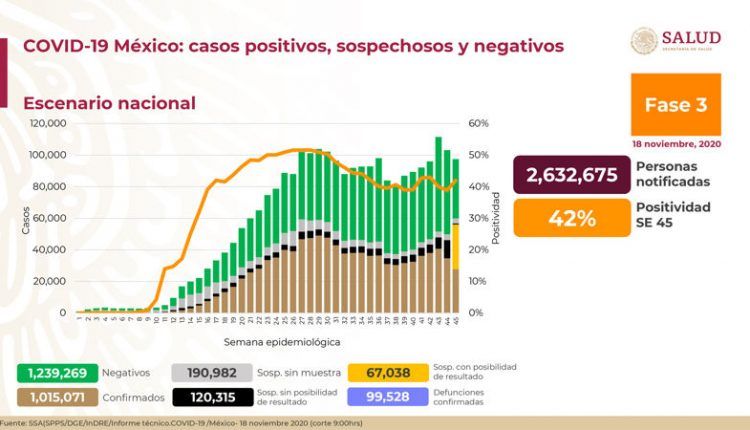 Autoridades de la Secretaría de Salud a nivel federal, informaron en conferencia de prensa vespertina que al 18 de noviembre de 2020 hay 1,015,071 casos confirmados de Covid-19 .