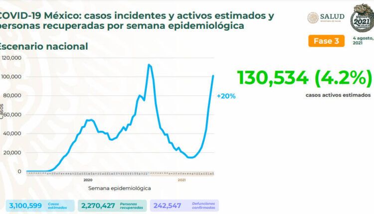 Autoridades de salud informaron que hasta este miércoles 4 de agosto se acumulan un total de 2 millones 901 mil 94 casos acumulados y 242 mil 547 defunciones, así como 473 mil 355 casos sospechosos 5 millones 228 mil 850 casos negativos 130 mil 534 casos activos estimados.