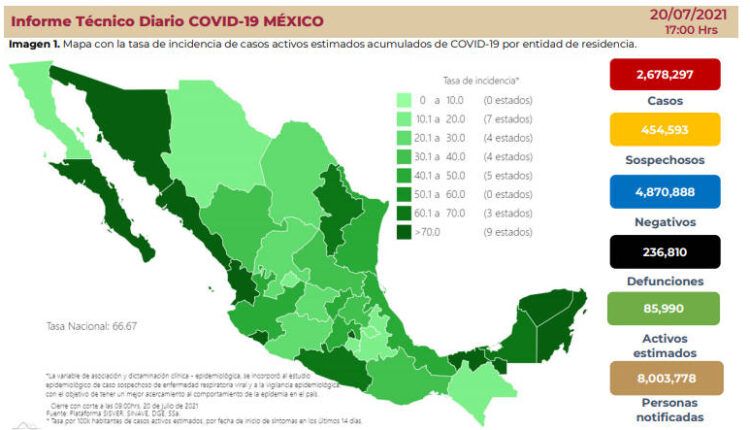 La Secretaría de Salud a nivel federal dio a conocer la tarde de este martes 20 de julio las cifras actuales del Covid 19.