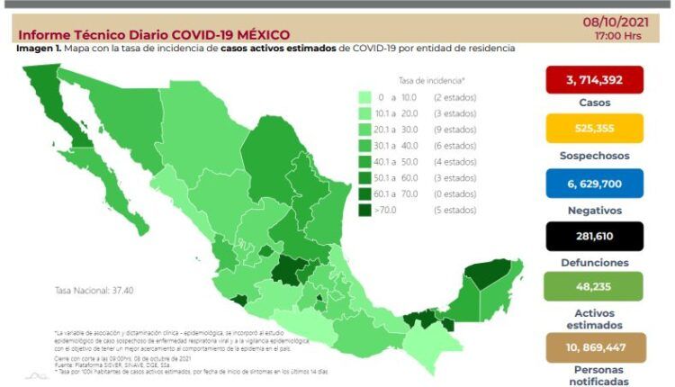 Al corte de información del día de hoy, se tienen registrados 44,464 casos activos con una tasa de incidencia de 34.5 por 100 mil habitantes (25 de septiembre al 08 de octubre del 2021).