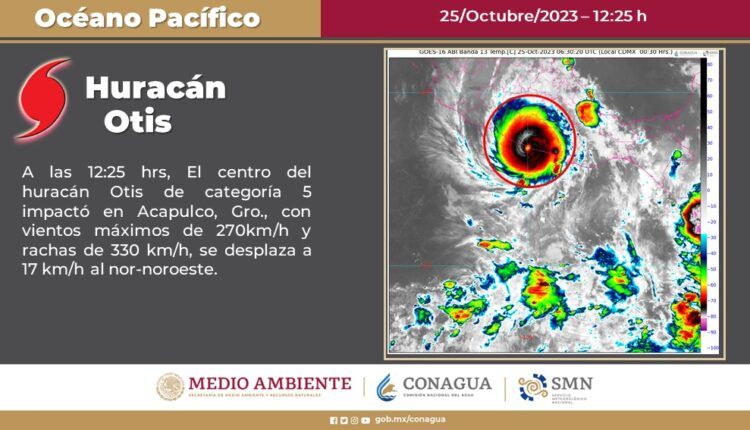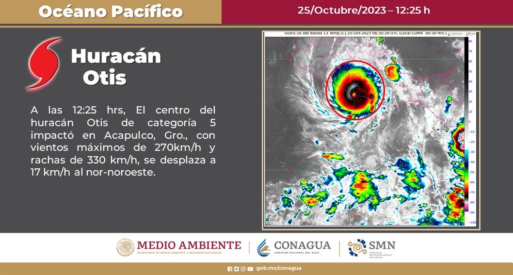La comisión Nacional del Agua informó que el súper huracan Otis impactó Acapulco en los primeros minutos del 25 de octubre del 2023 con categoría 5 en la escala de Saffir-Simpson y presentó vientos máximos sostenidos de 270 km/h y rachas de 330 km/h.