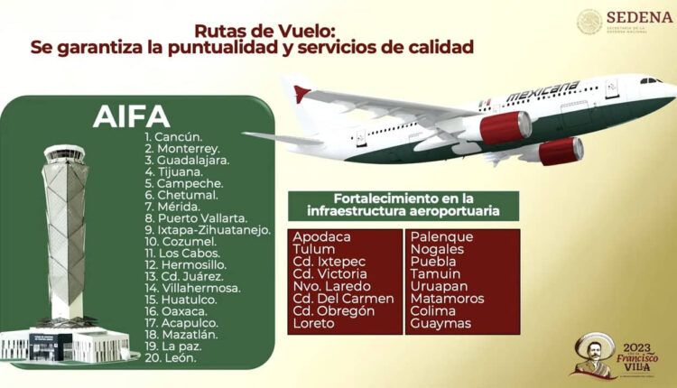 El general José Gerardo Vega Rivera, director del Grupo Aeroportuario y Ferroviario Olmeca-Maya-Mexica, empresa encargada de administrar Mexicana de Aviación, informó que la aerolínea comenzará operaciones de manera inicial del AIFA hacia Baja California, Campeche, Chiapas, Guerrero, Jalisco, Nuevo León, Quintana Roo, Sinaloa, Tabasco, Tamaulipas y Yucatán, y posteriormente se agregarán cuatro destinos más: Nuevo Laredo, Tamaulipas, Uruapan, Huatulco y Ciudad Ixtepec.