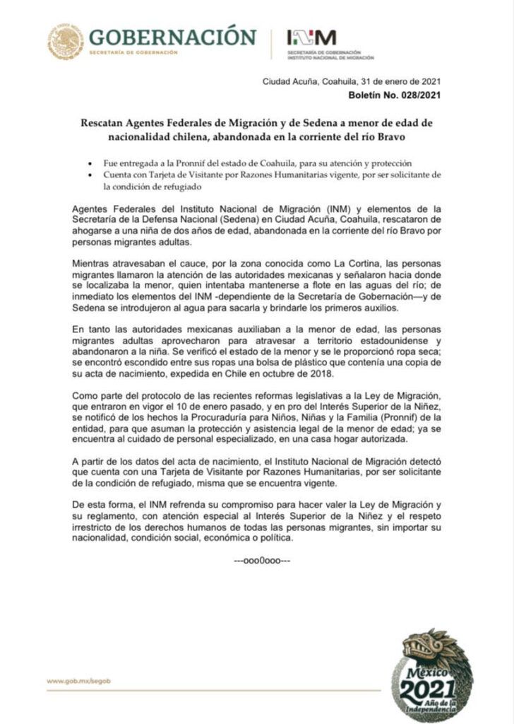 @INAMI_mx rescató a una niña 👶🏽 abandonada en aguas del #RíoBravo. Tiene nacionalidad chilena 🇨🇱 y cuenta con Tarjeta vigente por Razones Humanitarias en #México 🇲🇽 Recibe atención en una casa hogar de @pronnif: https://t.co/dX7W94UbNN pic.twitter.com/jqjZhiL0ft