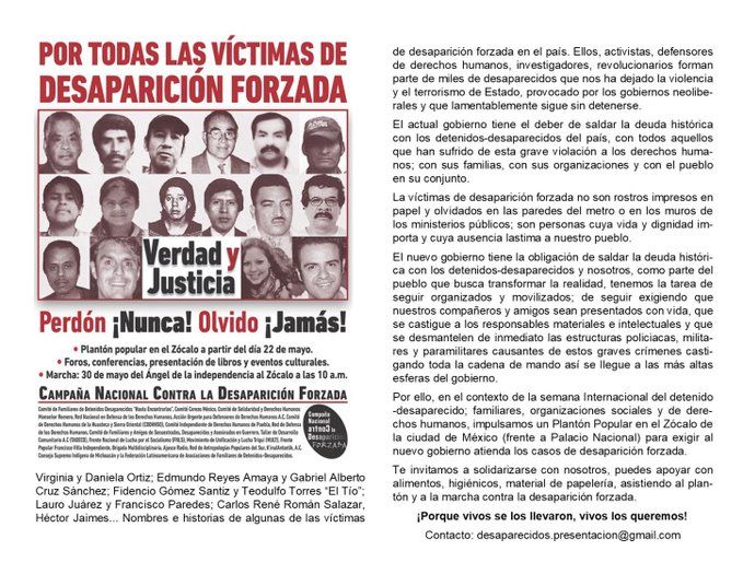 Señalaron que la desaparición forzada es un crimen de Estado y de lesa humanidad que no prescribe, por lo que convocaron este 30 de mayo a participar a esta marcha nacional, en el cierre de la Semana Internacional del Detenido Desaparecido, que partirá del monumento del Ángel de la Independencia al Zócalo de la Ciudad de México, a partir de las 10:00 horas de la mañana.